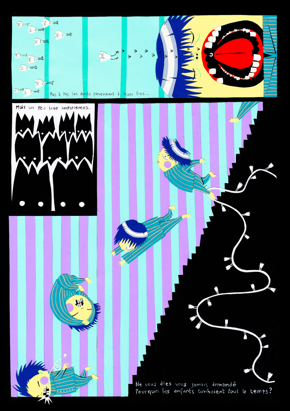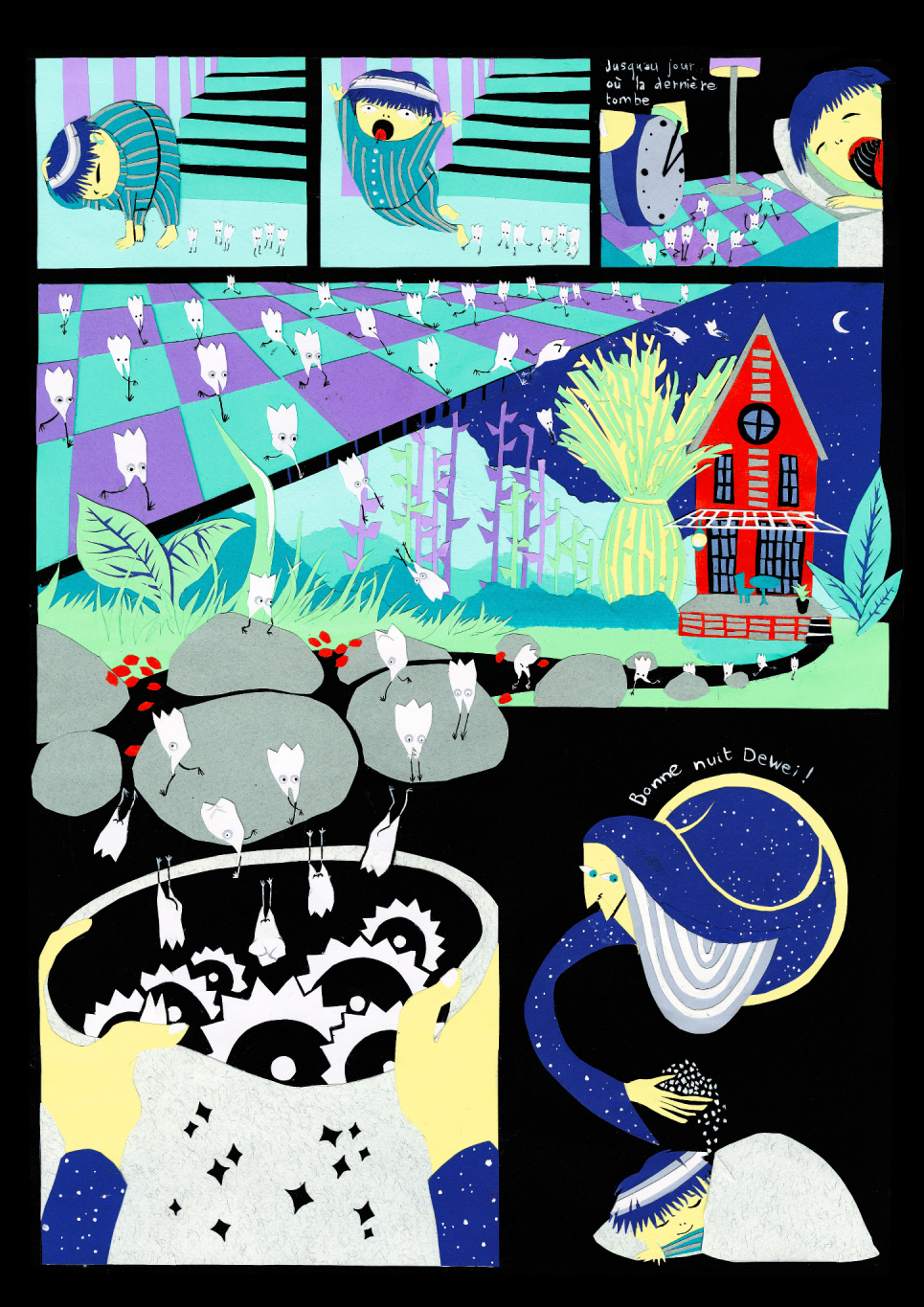 Trois planches réalisées en papier découpé. Prix Jeunes Talents 2018 du Festival International de la Bande Dessinée d’Angoulême, où elles ont par la suite été exposées.