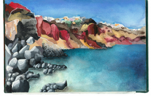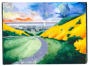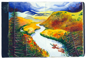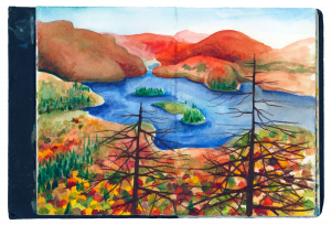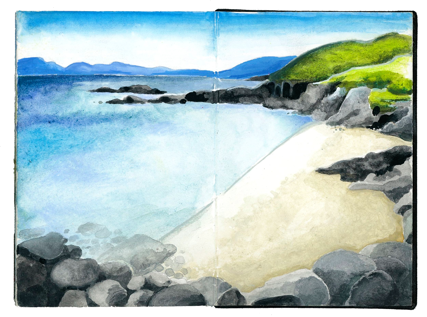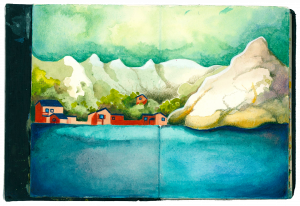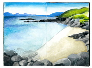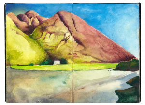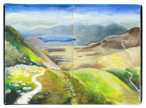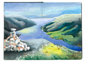 Carnets de voyage sont réalisés lors de séjours en solitaire. En amont, je choisis mes destinations en fonction des gammes de couleur que j’imagine de l’environnement. Sur place, confrontée à la réalité du terrain, je collecte alors des fragments de paysage, à travers l’observation et la peinture. Explorer la subtilité des nuances, des textures et des formes, et en restituer une perception sensible.
